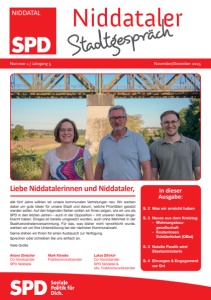 Niddataler Stadtgespräch Nummer 1 / Jahrgang 5 November/Dezember 2025 In dieser Ausgabe: S. 2 Was wir erreicht haben S. 3 Neues aus dem Kreistag - Wohnungsbau- gesellschaft - Kostenloses Schülerticket (OBst) S. 3 Natalie Pawlik wird Staatsministerin S. 4 Ehrungen & Engagement vor Ort Liebe Niddatalerinnen und Niddataler, alle fünf Jahre wählen wir unsere kommunalen Vertretungen neu. Wir werben dabei um gute Ideen für unsere Stadt und darum, welche Prioritäten gesetzt werden sollen. Auf den folgenden Seiten wollen wir Ihnen zeigen, wie wir uns als SPD in den letzten Jahren – auch in der Opposition – mit unseren Ideen einge- bracht haben. Einiges ist bereits umgesetzt worden, auch ohne Mehrheit in der Stadtverordnetenversammlung. Für das, was bisher nicht verwirklicht wurde, werben wir um Ihre Unterstützung bei der nächsten Kommunalwahl. Gerne stehen wir Ihnen für einen Austausch zur Verfügung. Sprechen oder schreiben Sie uns einfach an. Viele Grüße Ariane Streicher Co-Vorsitzende SPD Niddatal Lukas Dittrich Co-Vorsitzender SPD Niddatal & stlv. Fraktionsvorsitzender Mark Köneke Fraktionsvorsitzender NIDDATAL